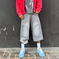 These ripped denim shorts feature a rhinestone embroidered logo as a highlight. The vintage distressed texture, combined with sparkling rhinestones and delicate embroidery, exudes individuality, sophistication, and a trendy feel.